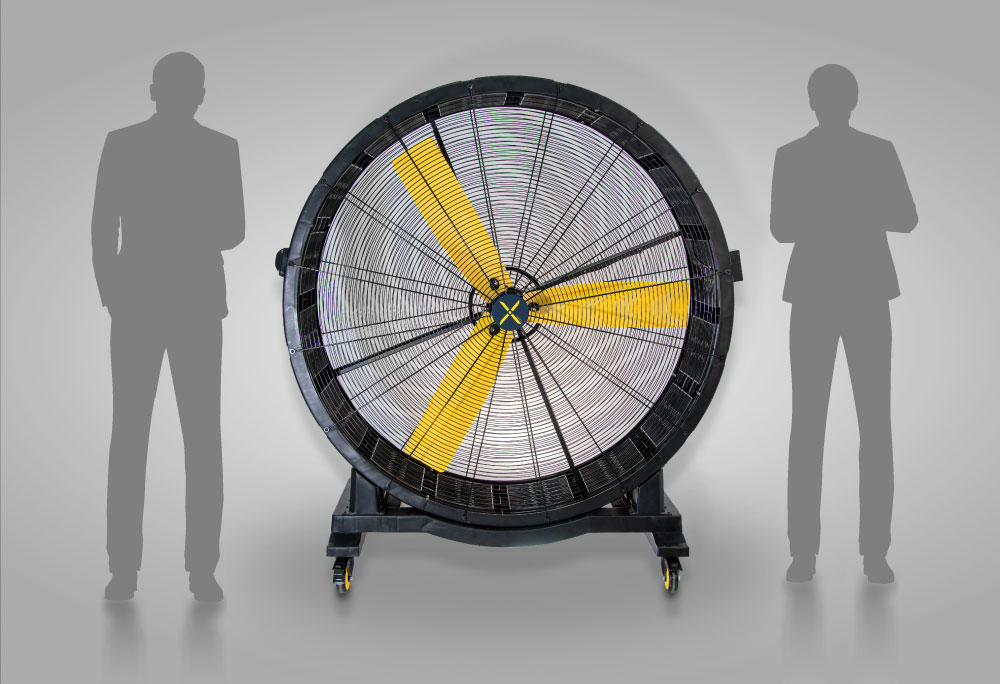 Ventilador industrial portátil CYCLO LT-150. Robusto y portátil, diseñado para grandes superficies. Con 1,5 metros de diámetro, velocidad regulable y motor de bajo consumo, ofrece ventilación potente y eficiente en entornos industriales exigentes.